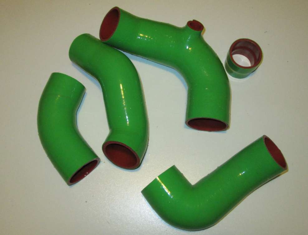 ZESTAW PRZEWODÓW SILIKONOWYCH INTERCOOLERA , stosowany samochodach VOLVO 940/960 z silnikami 2,0 oraz 2,3 turbo. Kolorem czerwonym oznaczono łączniki i węże silikonowe wchodzące w skład zestawu.