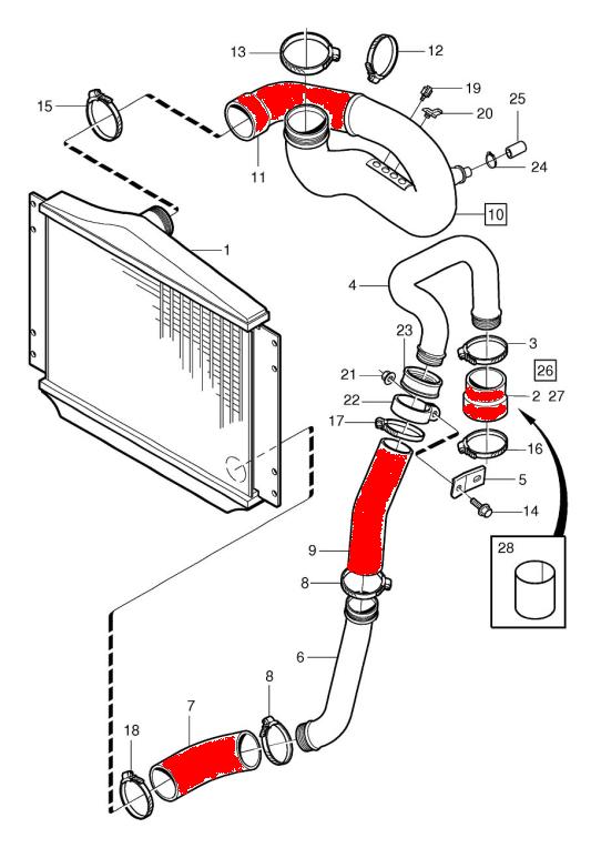Silikonowy zestaw przewodów intercoolera , stosowany w samochodach VOLVO S/V70, V70XC, C70, z benzynowymi silnikami turbo, produkowanych po 1999 roku. Kolorem czerwonym oznaczono łączniki i węże silikonowe wchodzące w skład oferowanego zestawu.