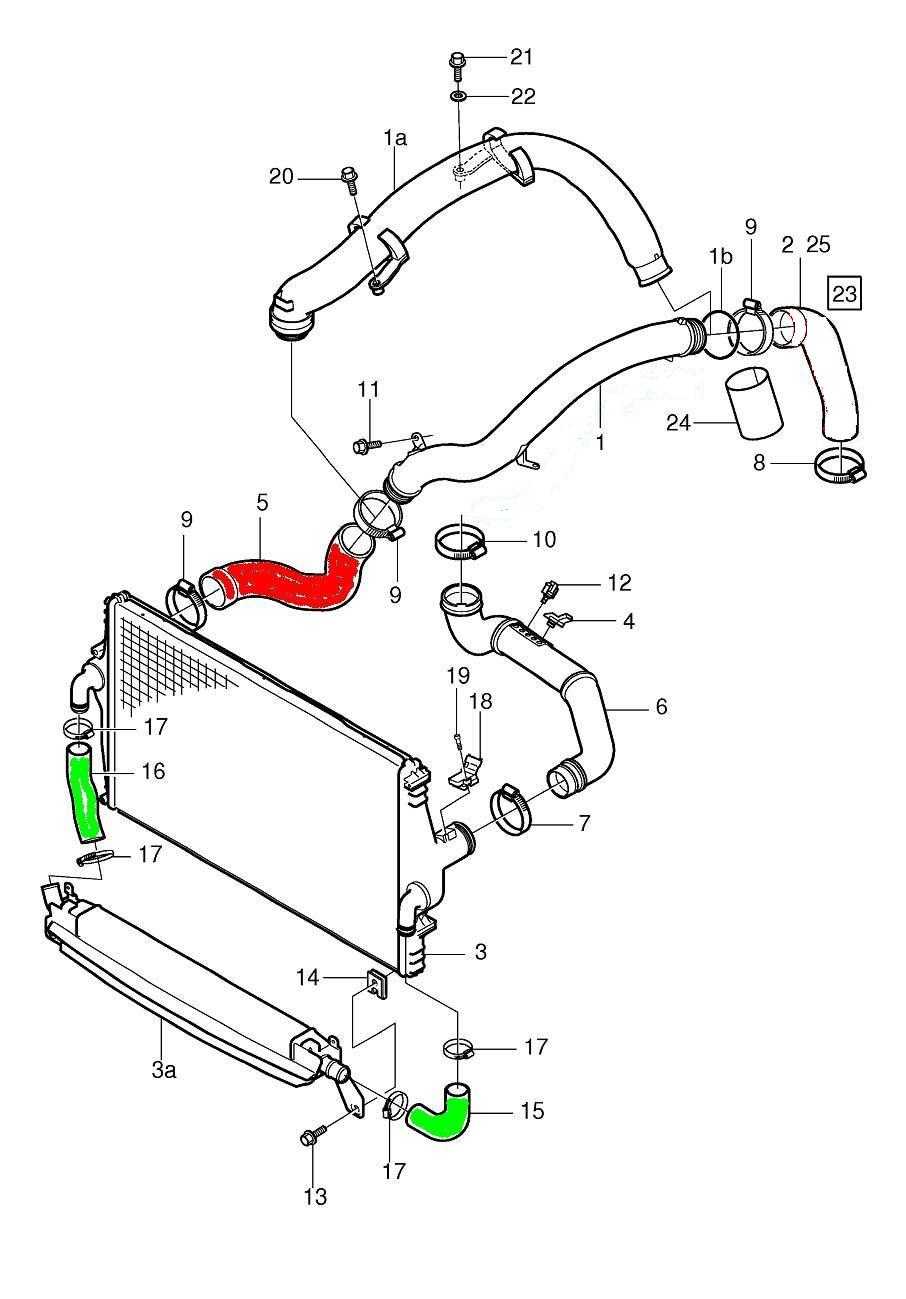 Silikonowy przewód górny intercoolera, stosowany w samochodach VOLVO V70N, S60, XC70 z benzynowymi silnikami turbo, produkowanych po 2001 roku. Zastępuje przewód OE VOLVO 31261372. Na schemacie oznaczony numerem 5. Kolorem czerwonym oznaczono pozostałe łączniki i węże silikonowe do tego wariantu układu turbo dostępne w ofercie MArsil.